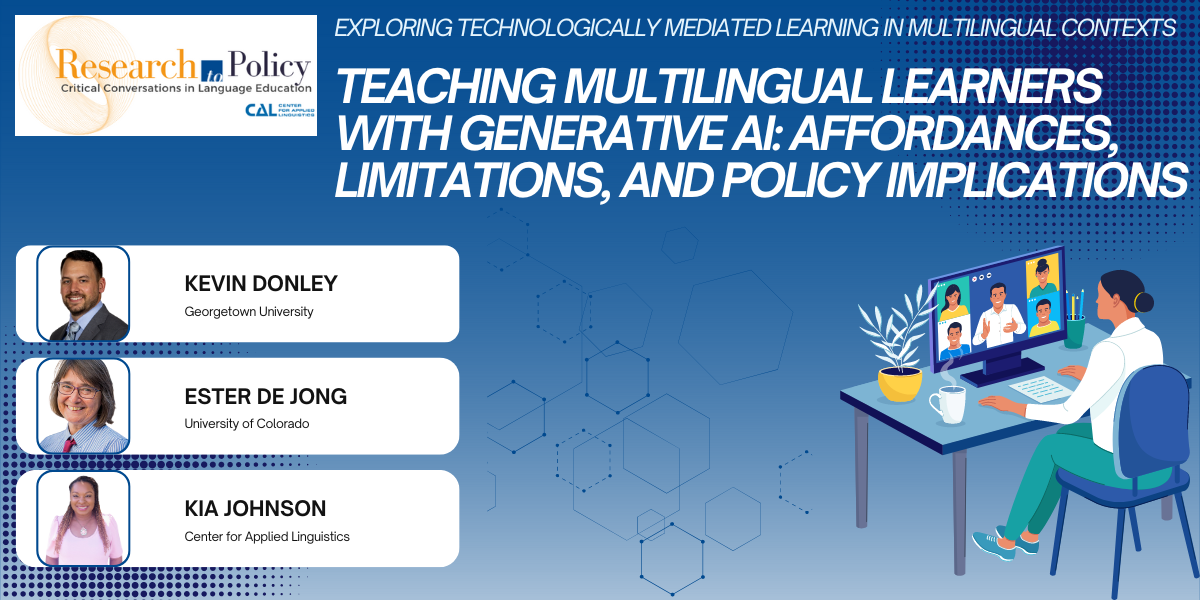 DETAILS: This webinar explores how teachers can use generative artificial intelligence (GAI) to maximize access to content and agency in literacy learning for multilingual learners (MLs). Join CAL Board member Ester de Jong of the University of Colorado and CAL’s Director of PK-12 Language and Literacy, Kia Johnson, for an insightful conversation with Kevin Donley of Georgetown University. The speakers will discuss how AI tools, such as ChatGPT, can expand possibilities for teachers to practice linguistically responsive pedagogies. Listen for examples of how teachers can enhance existing scaffolds and accommodations, create new multilingual content, and facilitate multimodal and multilingual writing activities through student-generated text prompts, such as generating and requesting changes to images.