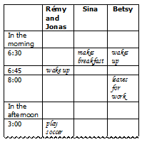 Table 1 describes sample activities for a beginning-level ESL lesson on daily routines. The teacher provides a simple story about a family’s routines. It could be her own or learners’ stories presented orally, using pictures, or in writing; or it could be a story from a beginning-level text. After leading a warm-up activity to develop background information and vocabulary (e.g., showing pictures of daily routines and asking questions and teaching specific words), teachers can have students organize the information provided in a variety of ways. The activities described here could be used for a lesson on job routines as well.