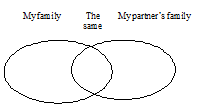 The Venn diagram helps learners recognize visually the concept of comparing and contrasting information. Venn diagrams can be used to practice organizing information in a new way. Follow-up questions move students beyond talking about surface aspects of culture (e.g., food, clothing) to thinking critically about their choices. |