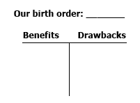 Activity 1 Once in birth-order groups, they brainstorm the benefits and drawbacks of their birth order and record their ideas on a T-chart.