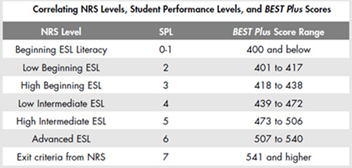 Standardized assessments used for federal accountability reporting, such as BEST Plus, are aligned with the NRS levels. The two systems (SPLs and NRS levels) are distinct, but both describe the language proficiency of nonnative English speakers at various levels and can be used for various placement, diagnostic, reporting, and instructional purposes. The table below shows how NRS levels align with both SPLs and BEST Plus scale scores.
