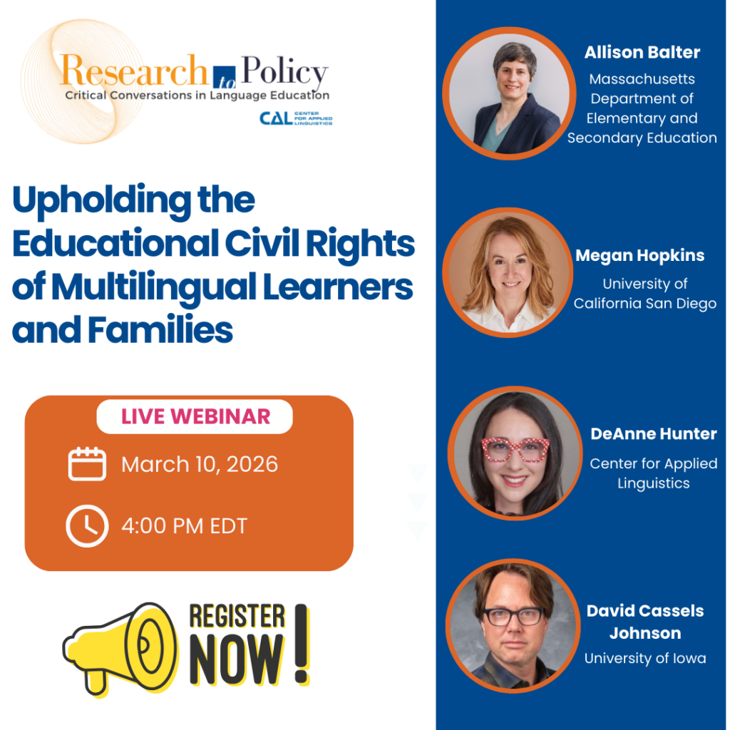 All webinars, recordings, and related materials produced by the Center for Applied Linguistics (CAL) are protected by copyright. They are made available exclusively through CAL’s official platforms for educational and informational purposes.